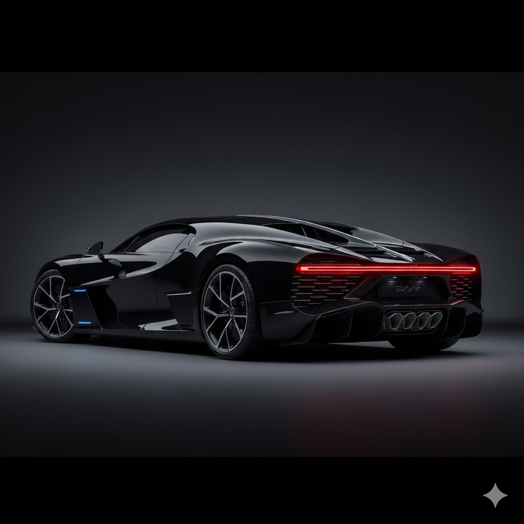 Siluet mobil ini dibuat sangat panjang dan rendah, menciptakan garis aerodinamis yang mengalir sempurna dari depan hingga belakang. Lampu LED berbentuk garis tipis menambahkan kesan modern dan futuristik, sementara diffuser belakang besar memperkuat kesan performa tinggi. Empat knalpot menyatu dalam satu panel unik, menegaskan karakter ekstrem La Voiture Noire.